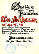 To the angel of Flossenbürg, Theo Aichholzer prisoner # 423, who in severe times saved the life of thousands of prisoners in the former KZ [concentration camp] Flossenbürg, in gratitude dedicated from the comrade 369 of former prisoners.