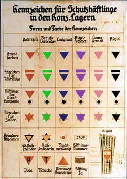 Prisoners where marked by multi color triangles sewn on the clothes (left chest and right leg) and this way divided into categories, the so-called Winkels.